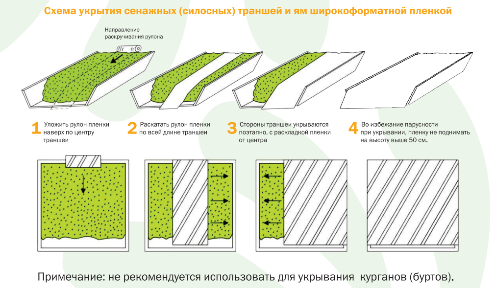 - Перед укладкой убедитесь, что на поверхности нет камней или острых предметов. Разложите по бортам и дну траншеи прозрачную вакуумную подкладочную плёнку толщиной 40 мкм. Она защитит корм от сырости.